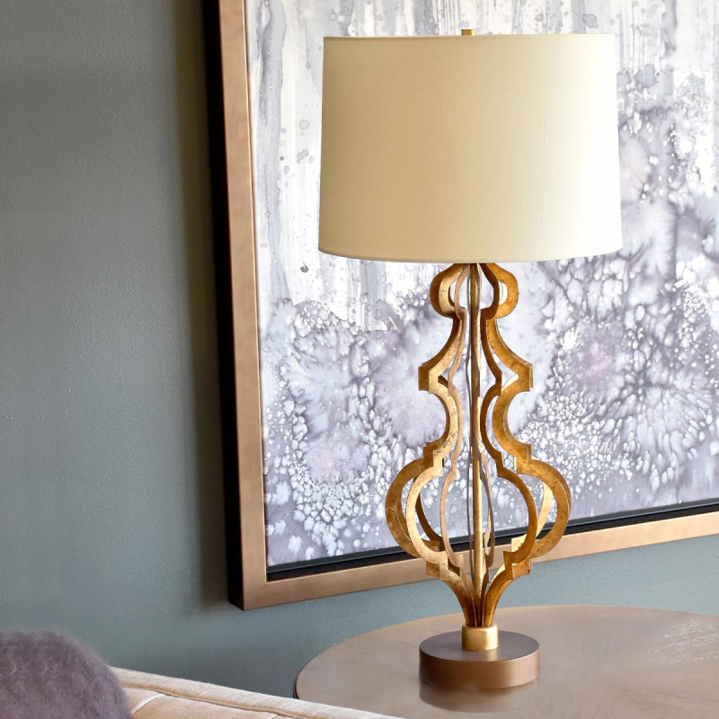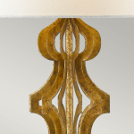 Namizno svetilo Octavia ima jekleno ogrodje v barvi starano zlato na temno rjavem podstavku, senčnik je iz kremnega lanenega blaga.