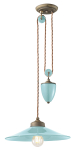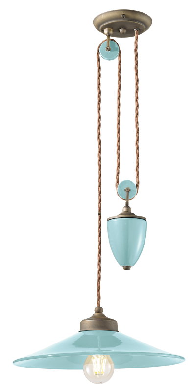 Barva: azurno modra, starana medenina. Kolekcija svetilk združuje barvno keramiko in starinsko medenino, kar je njen osnovni estetski podpis. Širok svetlobni snop ustvarja toplo in prijetno vzdušje v kateremkoli prostoru, kjer je svetilka nameščena, in prostor hkrati vizualno obogati.